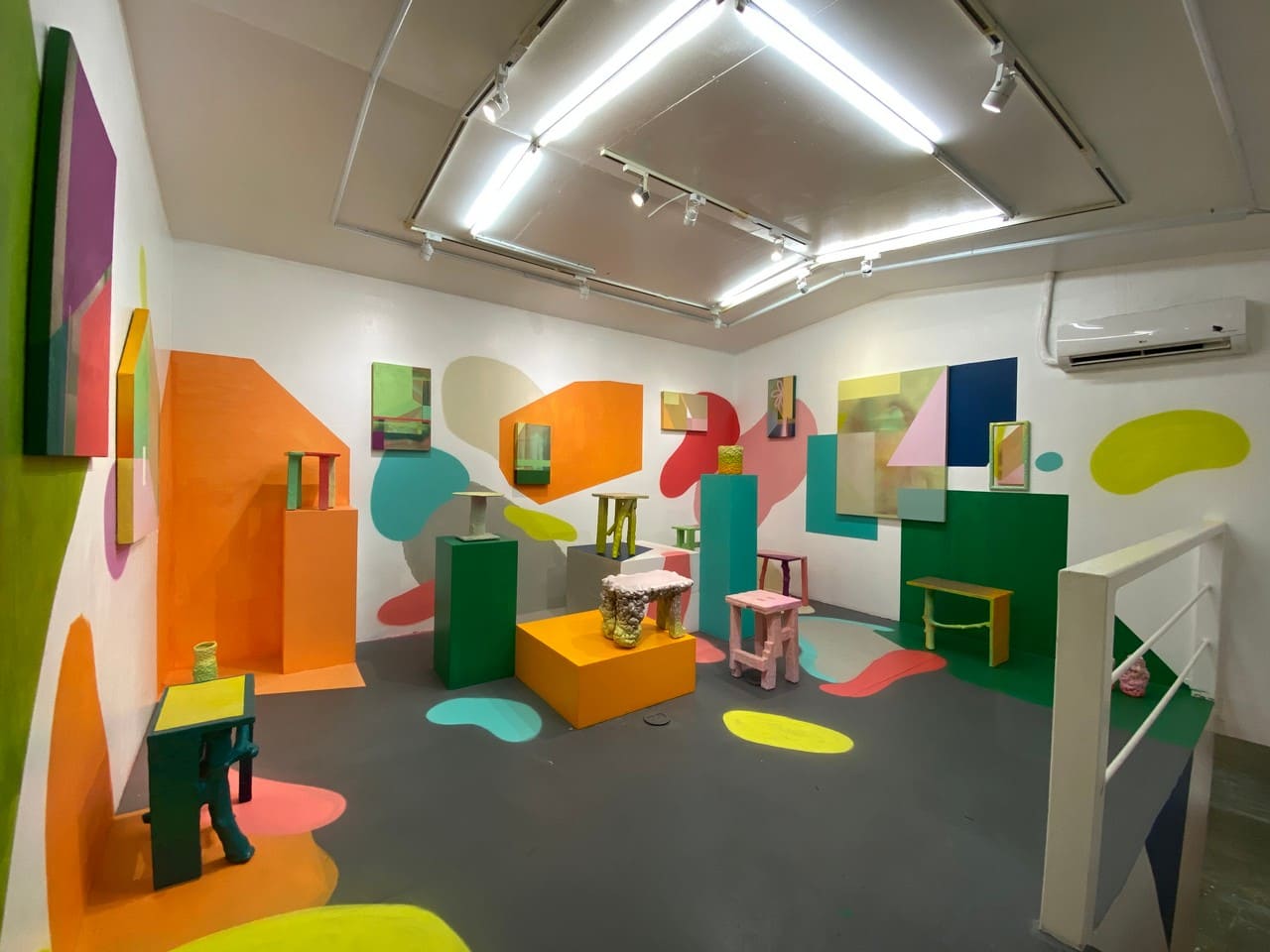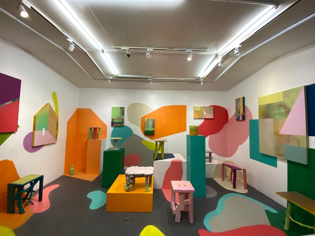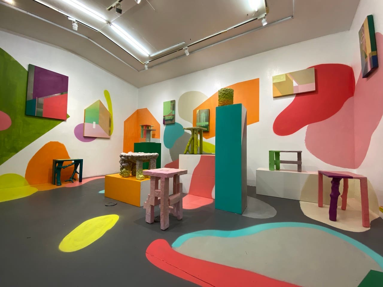 The exhibition design is itself, accentuates the calming effects of the objects on view. An inviting and smile-inducing display is created by adding traditional canvases and a mural of angular and rounded edges with warmer colors. These traits in organic design tame and melt us in the way we view, experience and appreciate the form, color, and movement of mundane objects.
