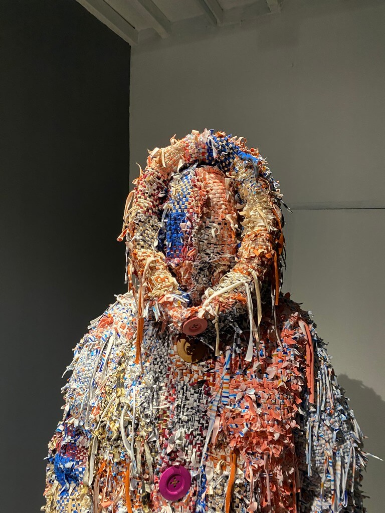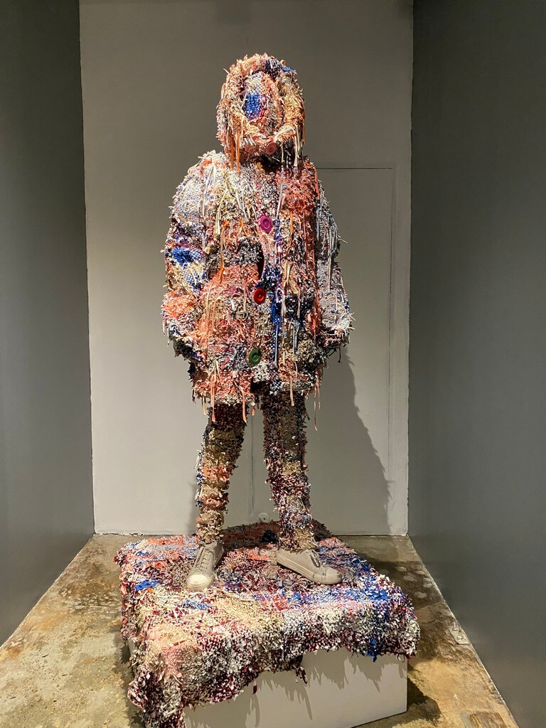 “Between Bad and Ok” features Soft Ledge, an avatar that the artist subjects to motions that bring rise to poignant sentiments. This is borne out of the artist’s meticulous weaving process seen on rugs made from discarded fabric. The wearable piece covers the artist’s entire body, transforming Tekla into a completely separate being by way of crafted skin.