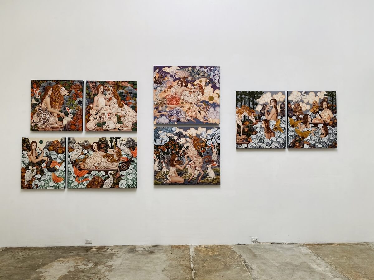 Unfolding A Page in Hyperspace is a veritable spectacle of celestial bodies, as de Jesus paints a skybound ship with maidens riding unusual flying vessels amongst the stars — a whale, a unicorn, a hare and a fish. The diptych continues with the maiden finally making it to land, where ruins and dark trees lay witness to a congregation of crocodiles seemingly calmed by gentle rabbits, and a raven symbolizing loss hovering. Borderline of Flesh and Dream shows a flowing river, gray and swampy, while undines guide a maiden’s boat through the choppy waters and prepare to secure it to the shore. A shy unicorn waits on land, almost teasingly testing the waters with its hoof. Islets serve as background, but instead of being laid flat on the water, it seems they are also trying to build height to reach the skies. In Setting Stages for Urgent Monologues, the water appears rougher, as we becomes unsure if the creatures caught on the churning waves of the river are still the friendly undines, or other beings. Several birds appear to be squawking, creating cacophony with a horn. This time, the unicorn is safely with the maiden on the boat, but we are not aware if danger does not eventually send their journey to disaster. Order Me A Sky from a Florist shows fortresses and ancient ruins in the woodlands as setting, with clear skies and twinkling stars in the heavens. However, the walls of the fortresses seem to forbid further exploration, creating a dead end, while elevated structures are built to reach the moon in futility. A fire is out and all is calm as unknown shadows haunt the periphery yet offer comfort all the same. A lion, a sworn rival, faces the unicorn, and what happens next becomes mystery to be told another day.