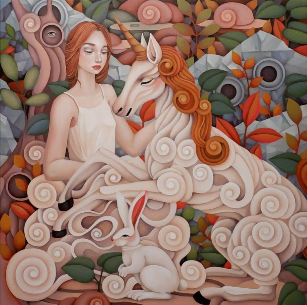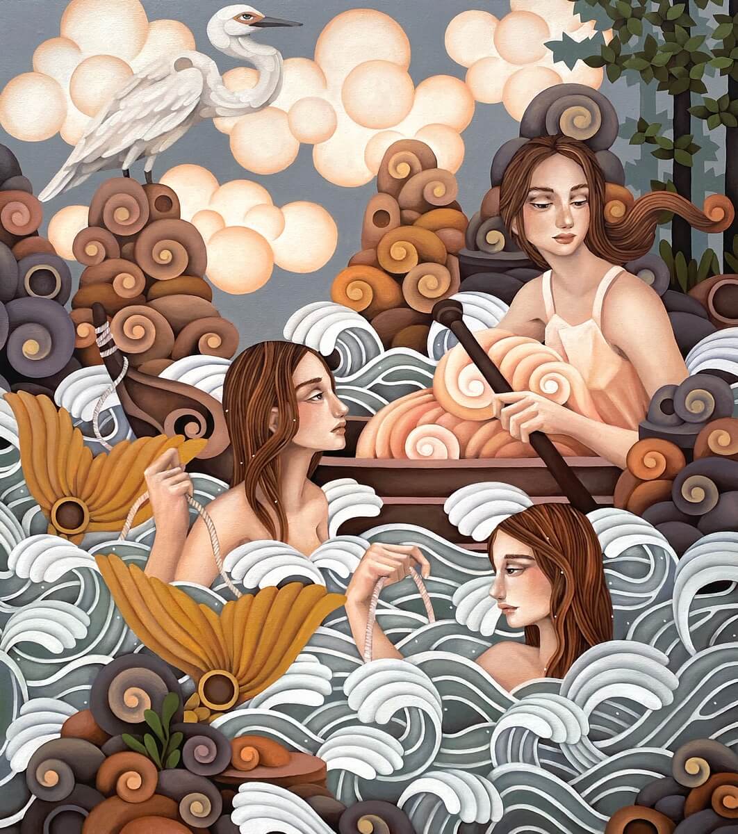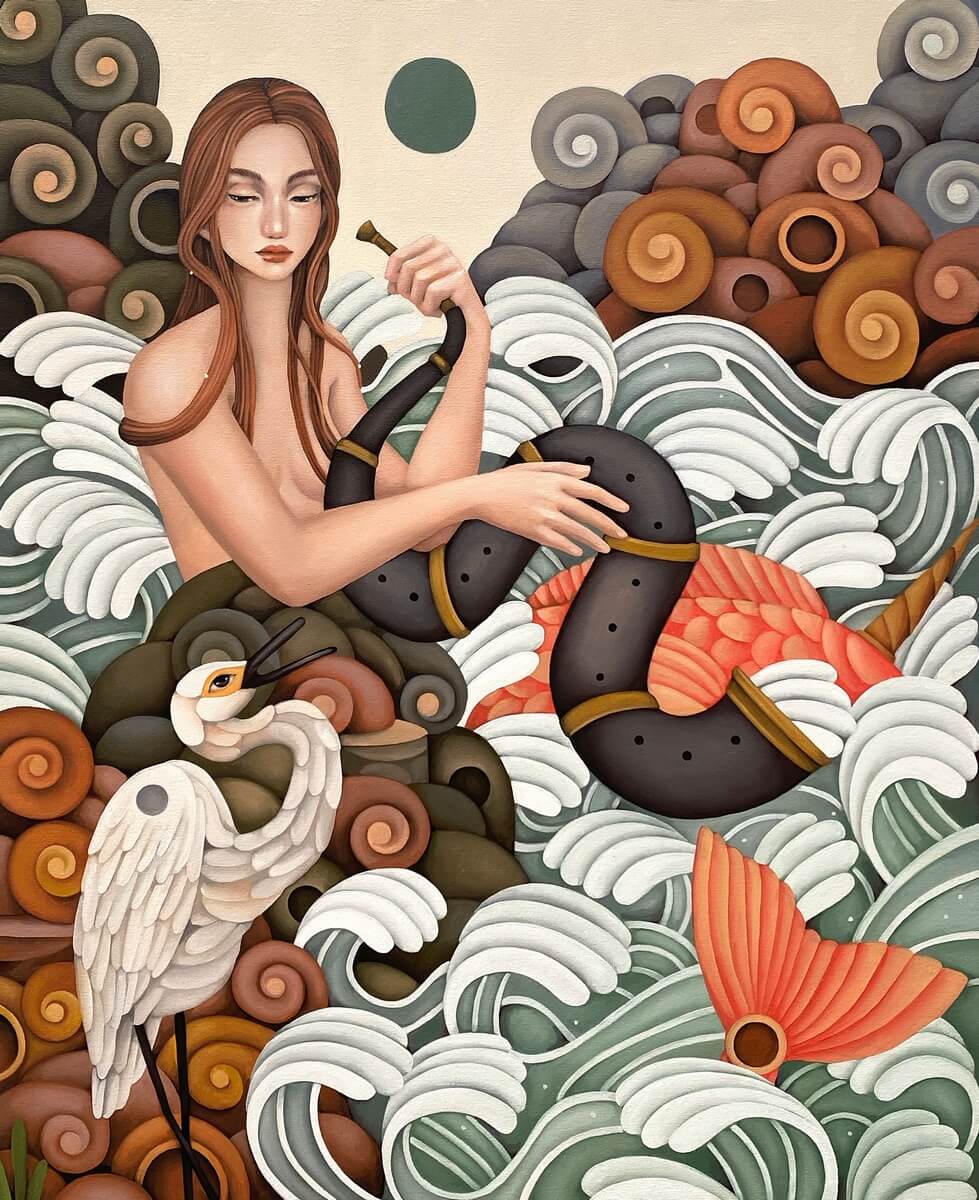 As de Jesus’ maidens and unicorns become the imagery of lore and legend, the lyrical interpretation of the scenarios we find the figures in imbue the works with wistful sadness and deep rumination. Across the ages, both the maiden and unicorn are symbols of prey being hunted: for their beauty, for their rarity, as trophies. By focusing on these characters, the artist shows not only the seduction of The Other’s gaze, but also the grace, strength and noble bearing that suffuse these gentle beings, despite of the violence and constraints meted them. In Slaughterhouse-Five, Kurt Vonnegut’s bestselling novel on war and timetravel, the lead character Billy Pilgrim is quoted as thinking, despite going through captivity and the horrors of war, that everything was beautiful and nothing hurt. Possibly narrating the character’s defense mechanism borne of PTSD, or rather, with a deeper reading, the author stating satirically that life does have ugly and painful parts, and these are the things we have to accept if we are to continue surviving, the artist draws on this parallelism in imparting truths in coping and tempering our resolve. De Jesus’ works come with the assertion that we may be sugarcoating reality whenever we process them as memories, much like filters found on social media – making everything hazy and giving them more favorable light, if only to protect our sanity and come to terms with it. We only have to count on what we know for sure–we all go through circumstances. Eventually pain disappears, and we find, on hindsight, that we become stronger as tragedies transform into precious lessons we learn along the way.