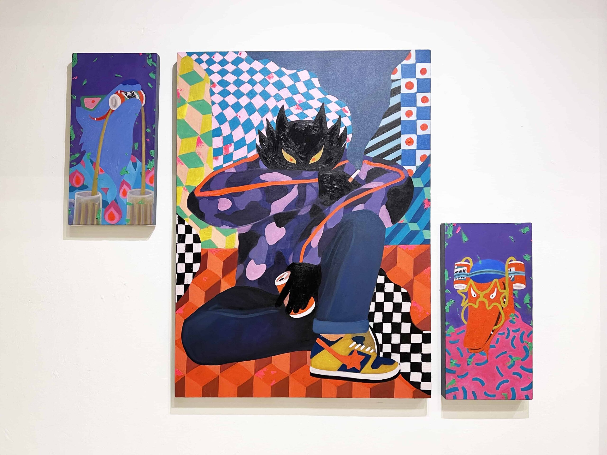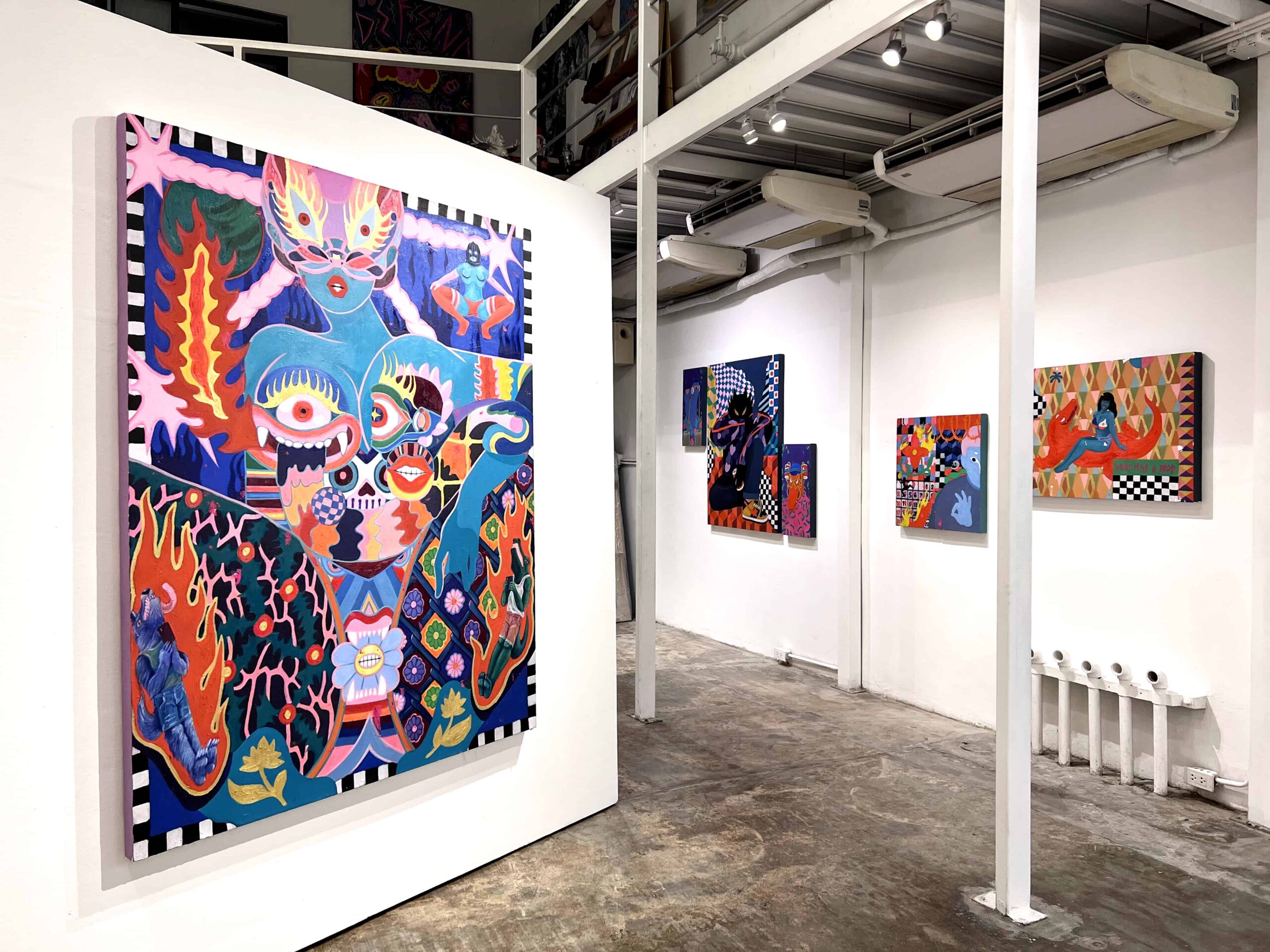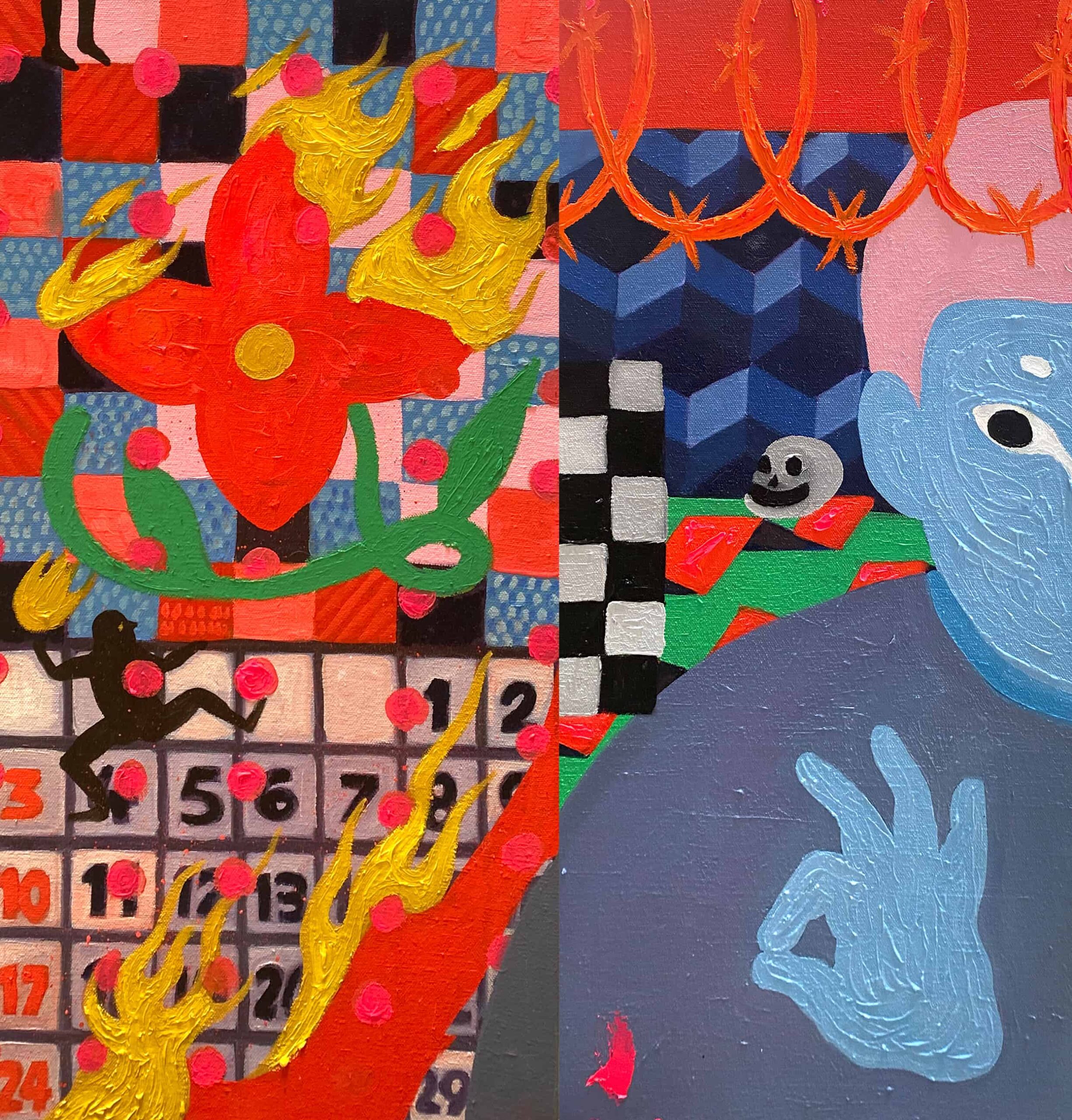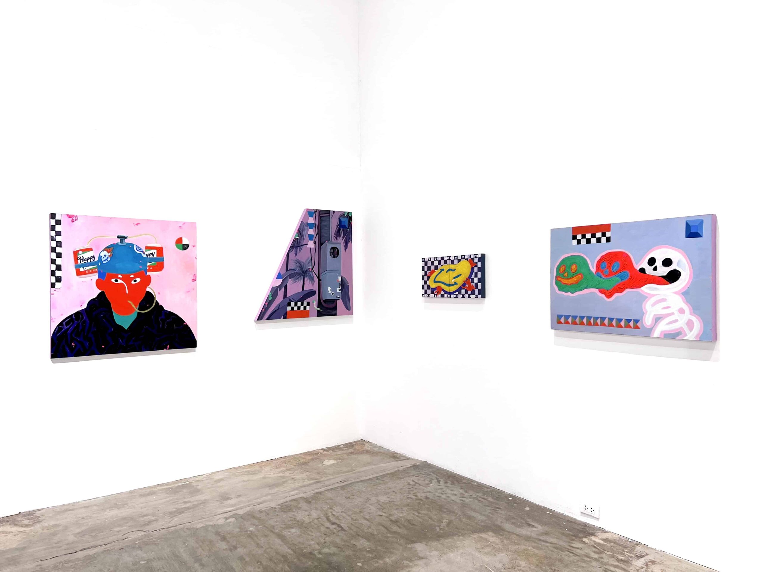 In “Happy Ending”, Bitto sends us all party invites to revel in the present. Through his signature graphic style, he incorporates quilting of images and patterns in order to share stories and experiences from the past, present, or an uncertain future. By utilizing optical illusions, he meticulously crafts a festive yet unsettling set of images. Inside it, there is respite from a dull and monotonous existence. This coupled with the pressures of the political significance of the month of May, he facilitates a momentary escape with this exhibition.