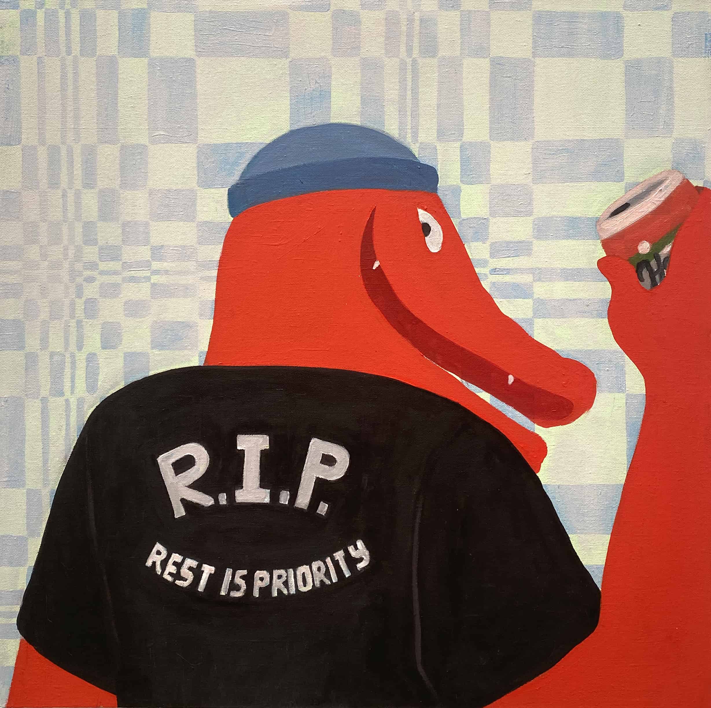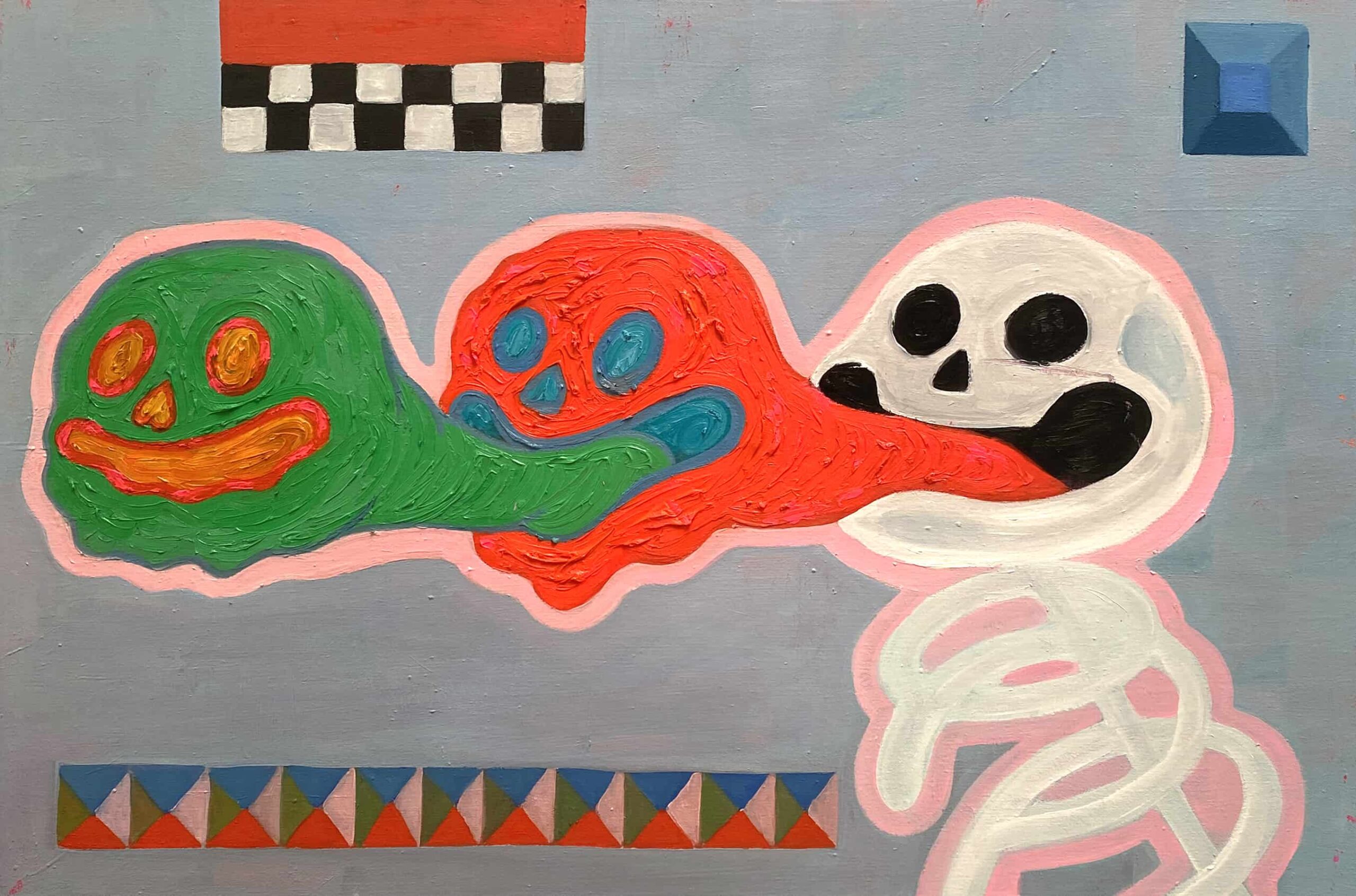 Bitto’s paintings are composed of various fragments coming from interior and exterior scenery of bars. His sprightly characters are contained in dizzying settings with hints of the apocalypse, such as in “Call Me Maybe”. As time passes and intoxication increases, the vivid colors and varying linear patterns present bring on a feeling of being in limbo between excitement and anxiety resulting from being under the influence. Acknowledging the ability of advertising to transform our view of ourselves as eager receptacles of ‘feel good’ experiences, a curious beverage appears in several compositions. The creation of a faux beer, complete with its product placement, promotes a carefree point of view. Additionally, it enables us to examine our relationship with social constructs around drinking as a collective affair that promotes fellowship.
