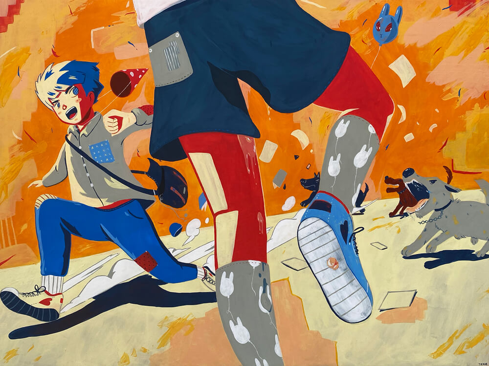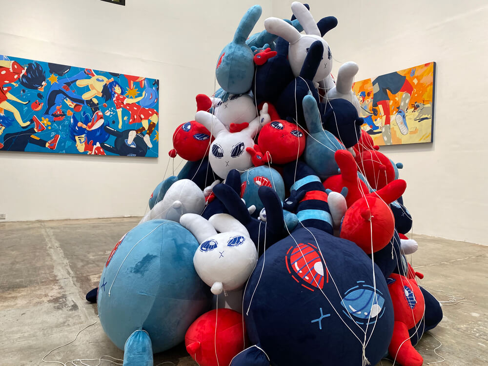 TRNZ’s art revolves around his own created universe of characters. In this brightly-hued universe, he explores various themes that are metaphorical and narrative-based. Like channeling his personal experiences while highlighting the different stages of his upbringing, and how it relates to his present self. From acrylic paintings to playing with various objects, TRNZ’s works jump from one medium to another.