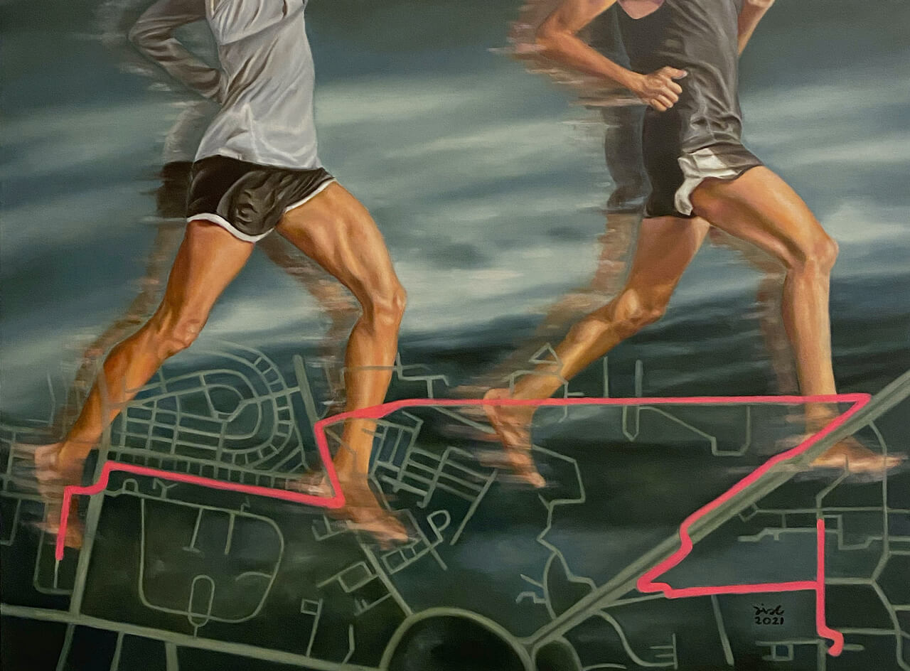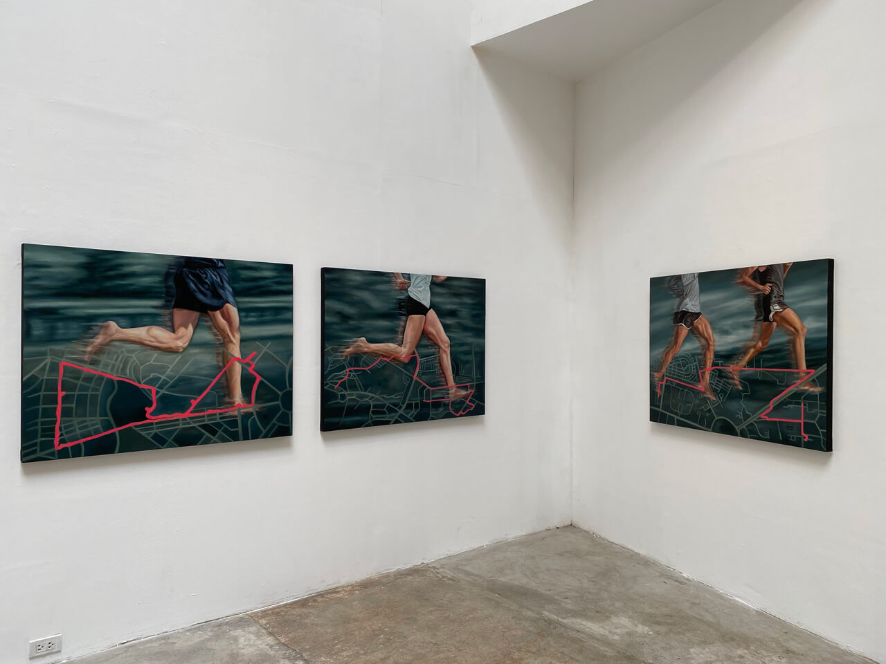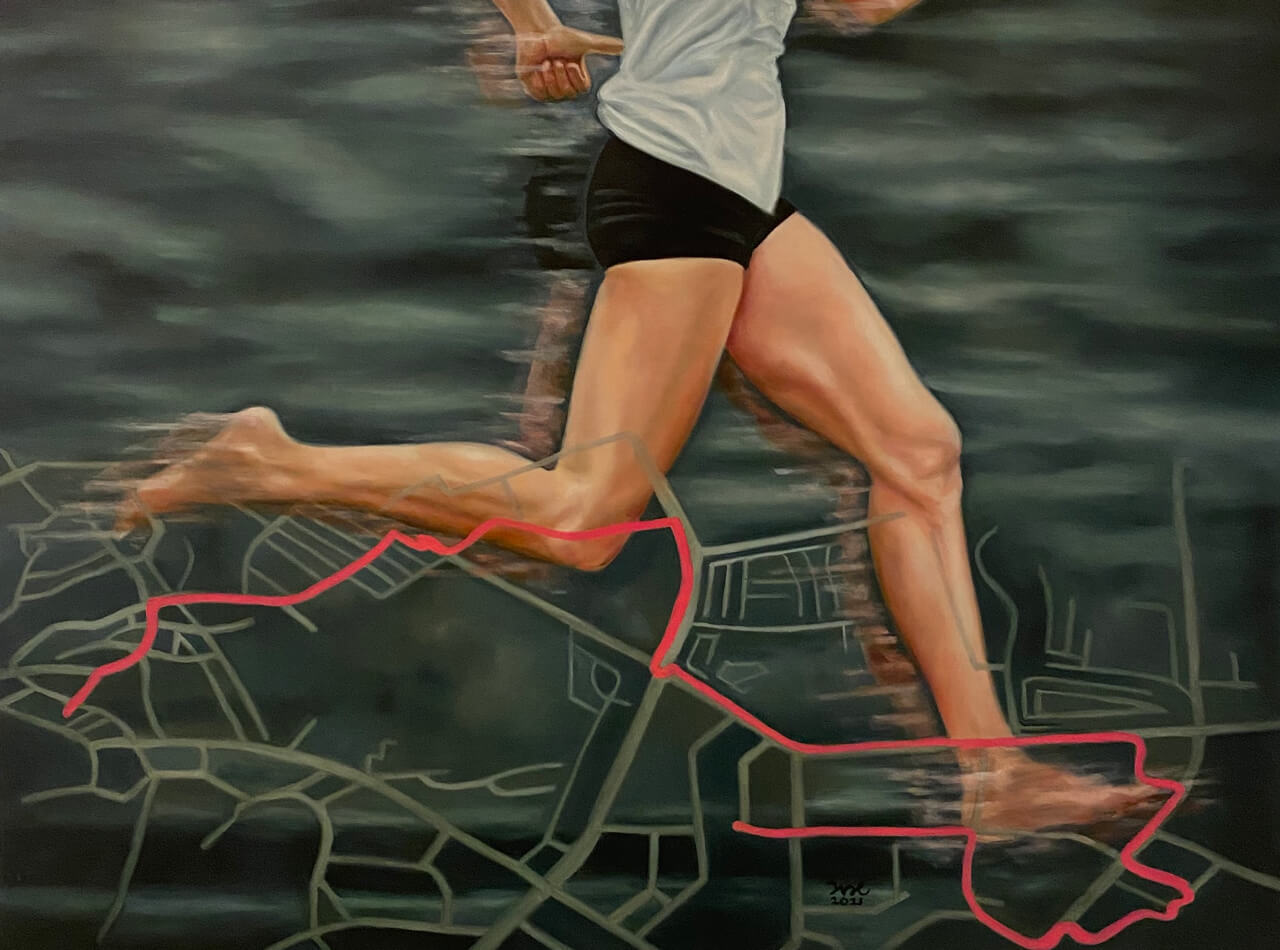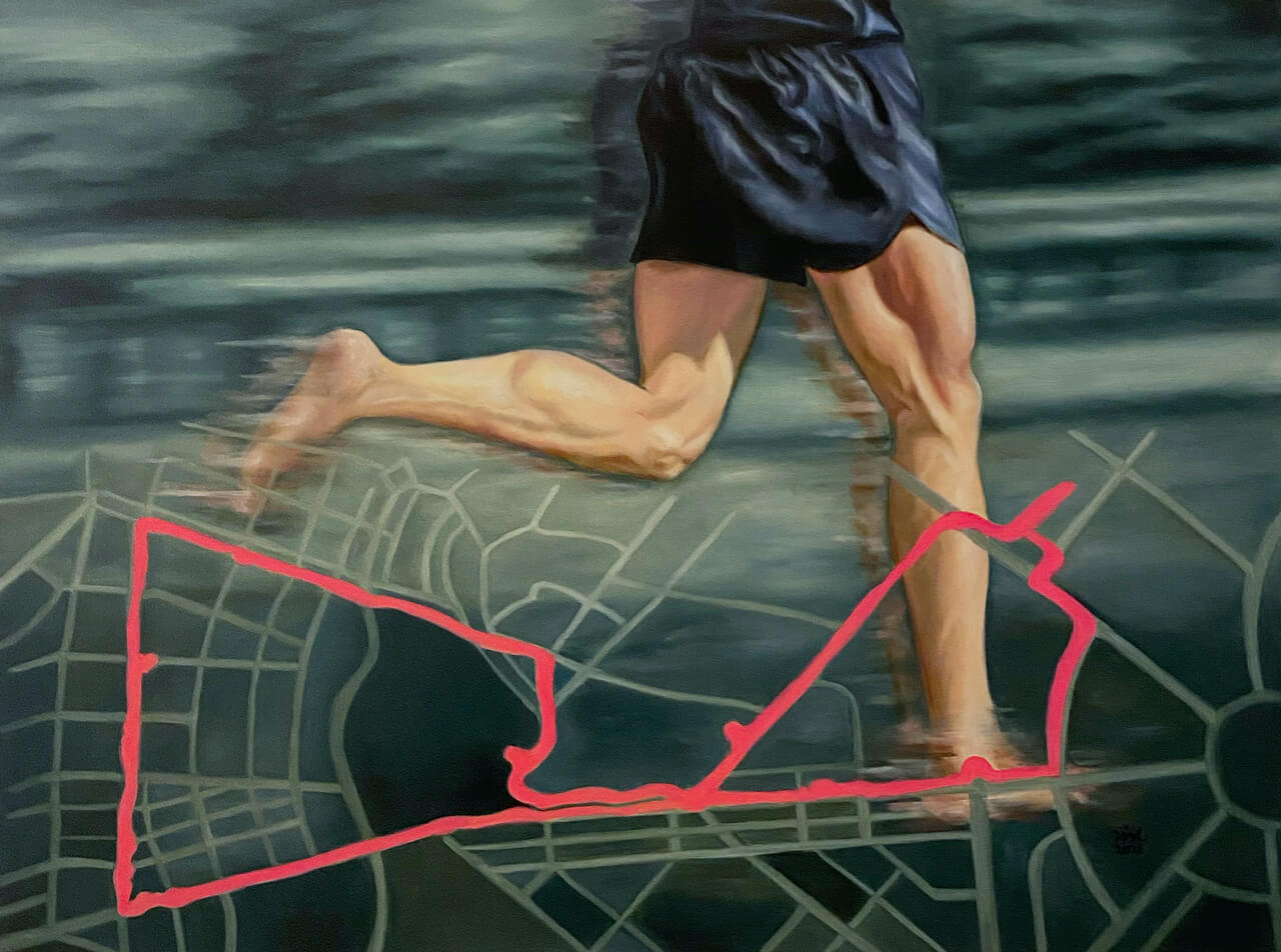 For Dial, who is an avid runner, the road provides an immediate cure for inactivity. For her collection of works, she represents the legs in a moment of propulsion, their muscles tensing, shiny with a film of sweat. There is something daring and honest with the feet being unshod, with the soles confronting the grit and roughness of the road. Underneath them lies an illustration of the city’s grids, with certain tracts highlighted to convey the distance covered, something that is familiar to those who use human exercise tracking apps such as Strava. This outline of highlighted tract is one’s own personal map, flexible and mutable against the fixed urban landscape.