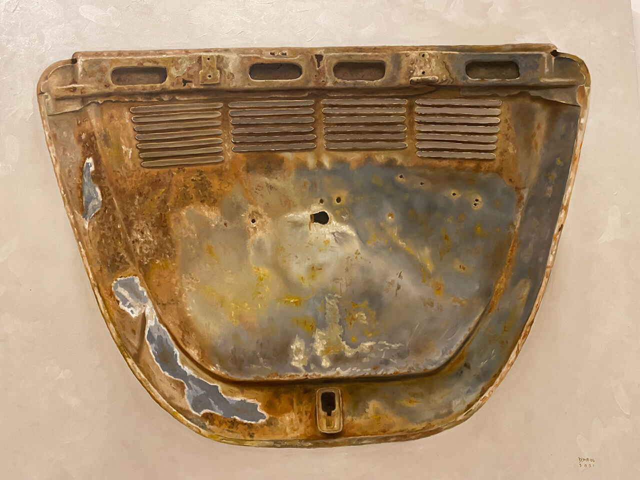 In his suite of works, Dela Cruz alludes to the road by depicting rusted parts of a Volkswagen. One noticeable element is the hood of the VW Type 2, possibly the most iconic vehicle during the counter-culture movement in the ‘60s. Though they are deconstructed, eaten through by wear-and-tear, ultimately unserviceable, they evoke the spirit of a much freer age, when hitting the road meant taking the adventure of a lifetime. Curiously, the minibus will be resurrected in the form of an electric vehicle next year, which just proves that nothing good is ever lost or, to quote the title, left behind.