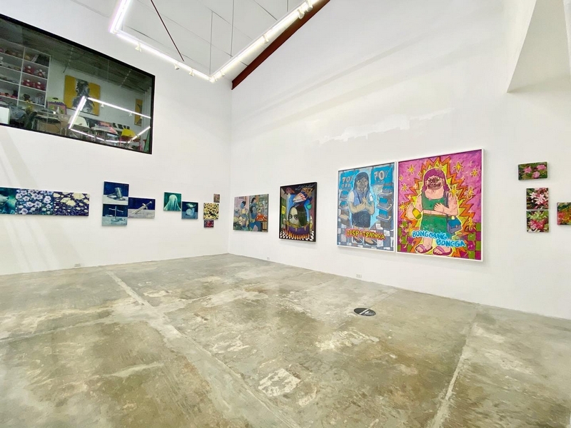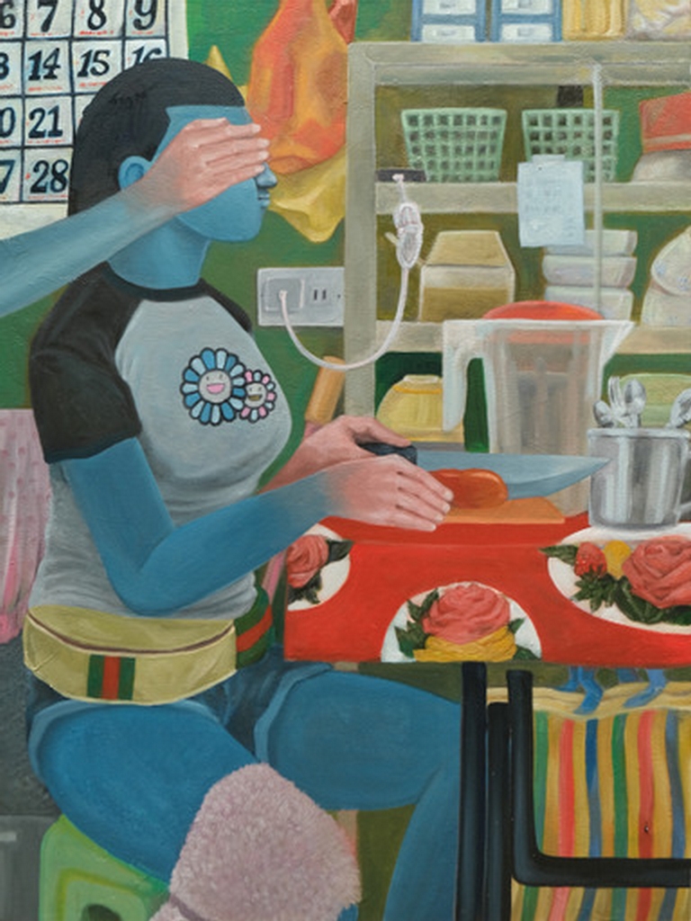 Flowers have traditionally been identified with feminine ideals owing to their resemblance to the female genitalia. As women have long been a symbol of life, by giving birth, breastfeeding and being fertile, so by association have flowers as reproductive organs of flowering plants. Through industrialization and the onset of global capitalism however, women began to play new roles as breadwinners by going to work as part of the labor force. In this system, they not only create and nourish their immediate family, they create and provide for the world. And yet, while they accomplish their new tasks, they are still burdened with traditional domestic roles. In neon- colored caricatures incorporating macabre and pop imagery, Bam Garibay and Anjo Bolarda tackle the invisibility and oppressiveness of domestic labor ironically in their reimagining of the Queen Hope and the Queen of Flowers as the housewife (“Simmer”), the provincial lass hired as nanny (“Shake Well”), and the flower (Slice of Life 2), fruit and food vendors (Slice of Life 3 and Slice of Life 2) respectively.