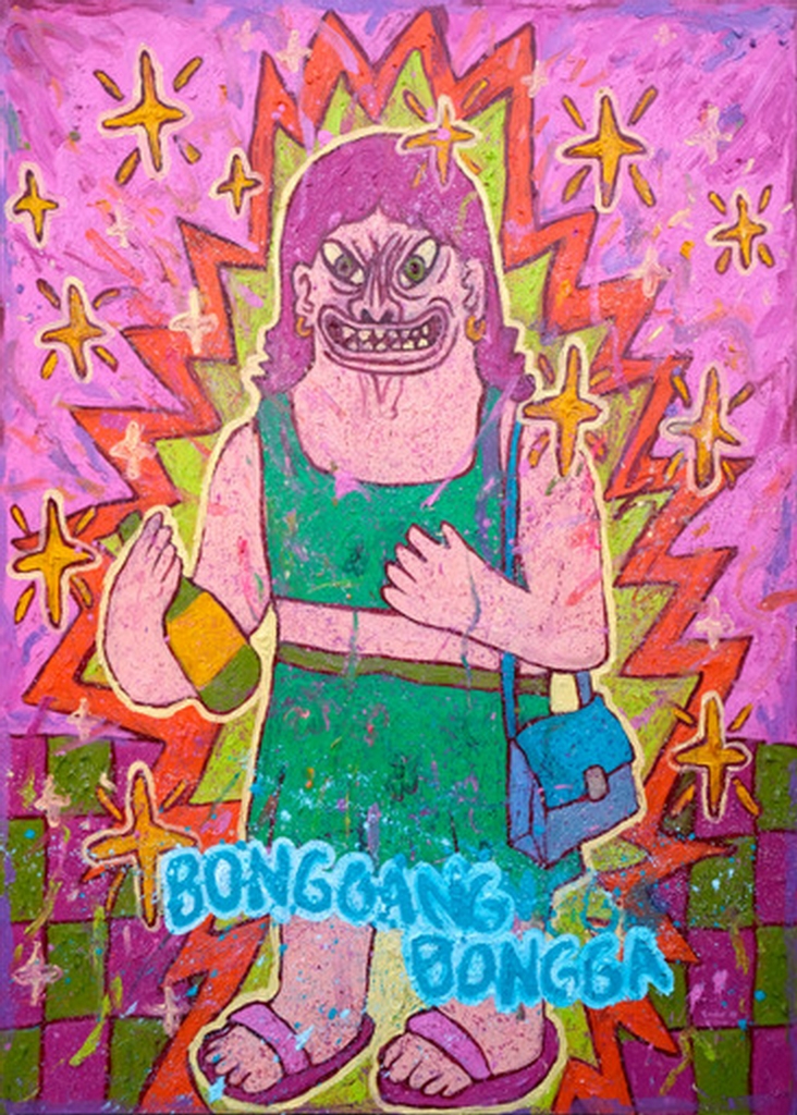 At first glance, Roger Mond’s party-vibe tongue-in-cheek renditions of the 1980’s Hotdog hit “Annie Batungbakal” provide comic relief. You can almost dance to the disco tune’s upbeat lyrics about Annie, who is “Sa umaga, dispatsadora, sa gabi siya’y bonggang-bongga!” But upon closer inspection, the pent-up angst in the saleslady’s face is unmistakable even when she ‘transforms’ as the queen of the dance floor, wearing the bag she is selling at the mall while clutching a beer bottle.