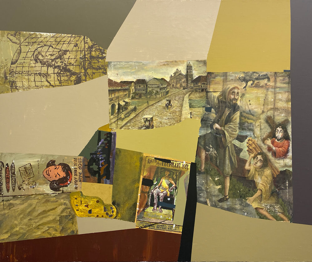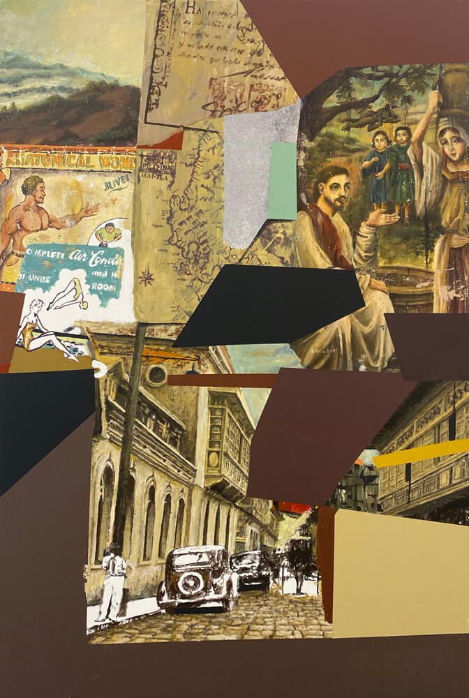 Raquepo flips this context in his recent works, as he injects contemporary elements such as geometric shapes and flat planes in his paintings, combined with antiquated maps and street scenes that he spontaneously applies on canvas, some with reimagined Spanish colonial naive and devotional art. Instead of abdominable alloy and chrome ultra-sleek SUVs, he paints old clunkers and tranvias on cobblestoned streets in rich sepia tones, with the additional visual treat of a subtly brightening sky. As he decries the loss of these snippets of history, he still makes an effort to interpret them faithfully, knowing that they are only representations of something that used to be there but do not exist anymore.