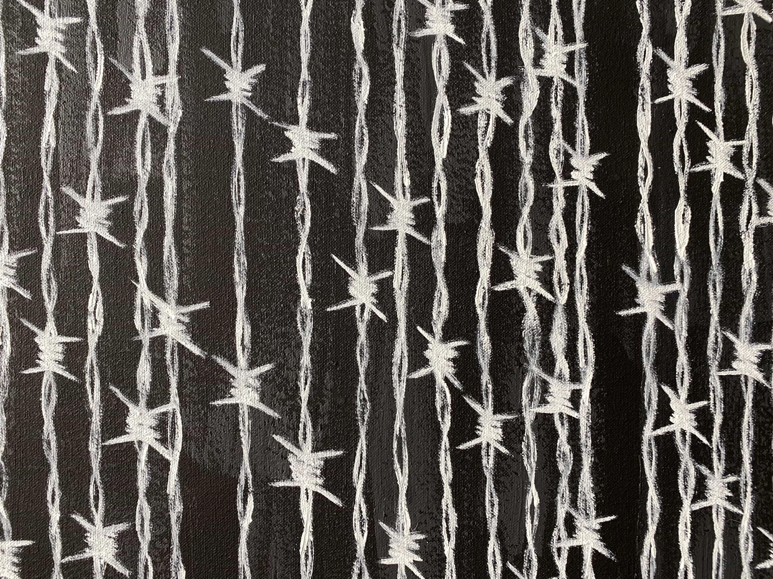 “Displacement” and “Border” represent the thorns that hinder indigenous belief systems. Through a wall of barbed wires, there is no going in or out. We see what lies beyond, we move, to a fashion, within our spaces, but remain trapped to a historical circumstance and spiritual revisionism.