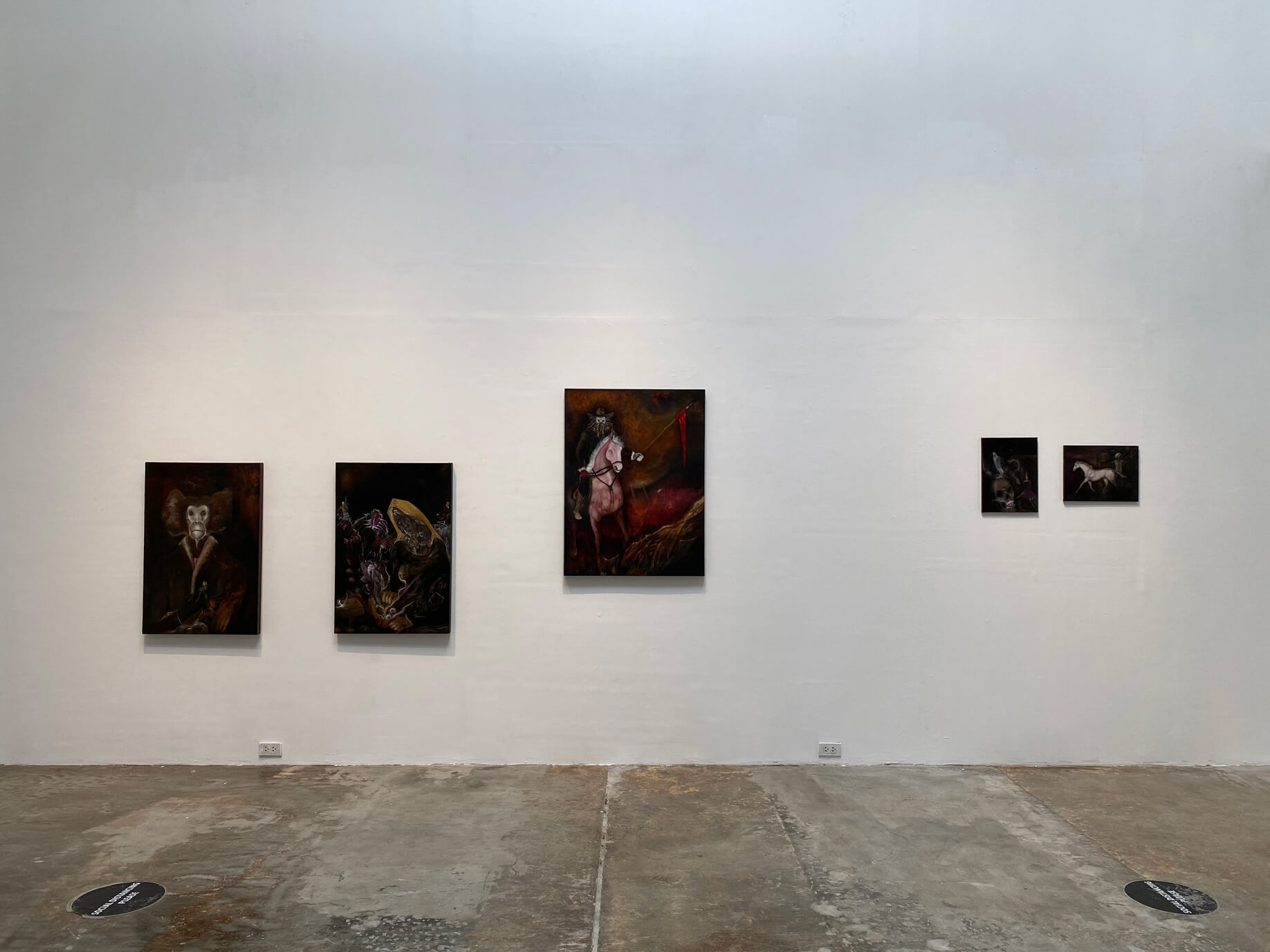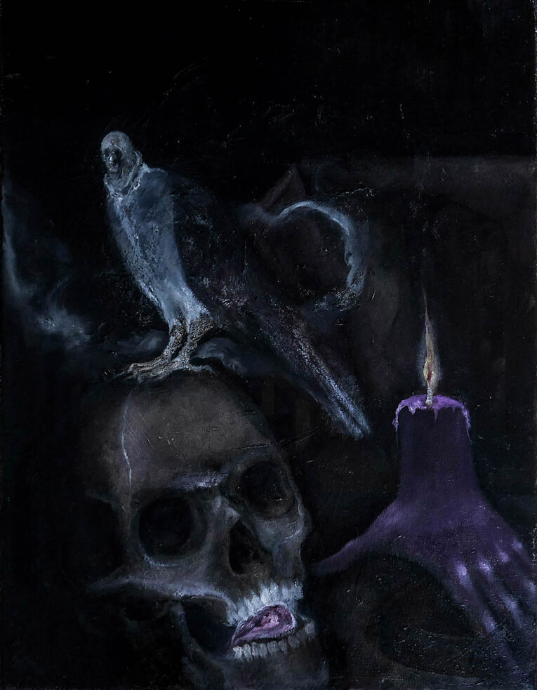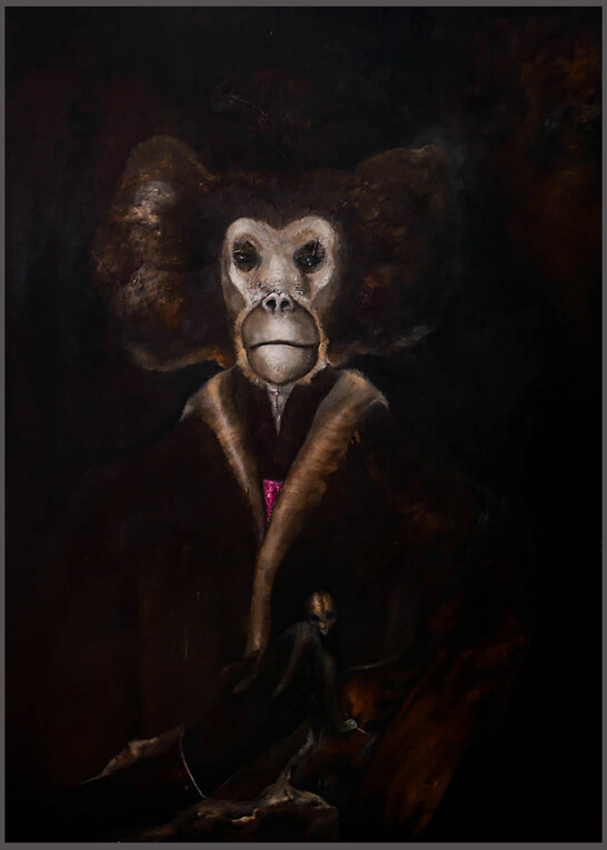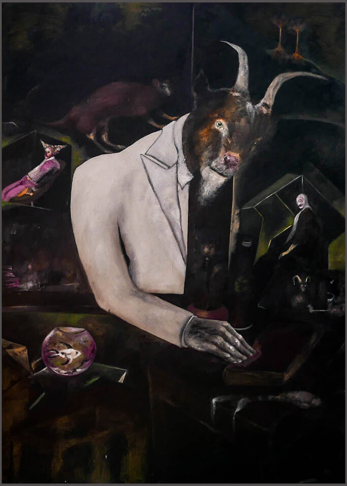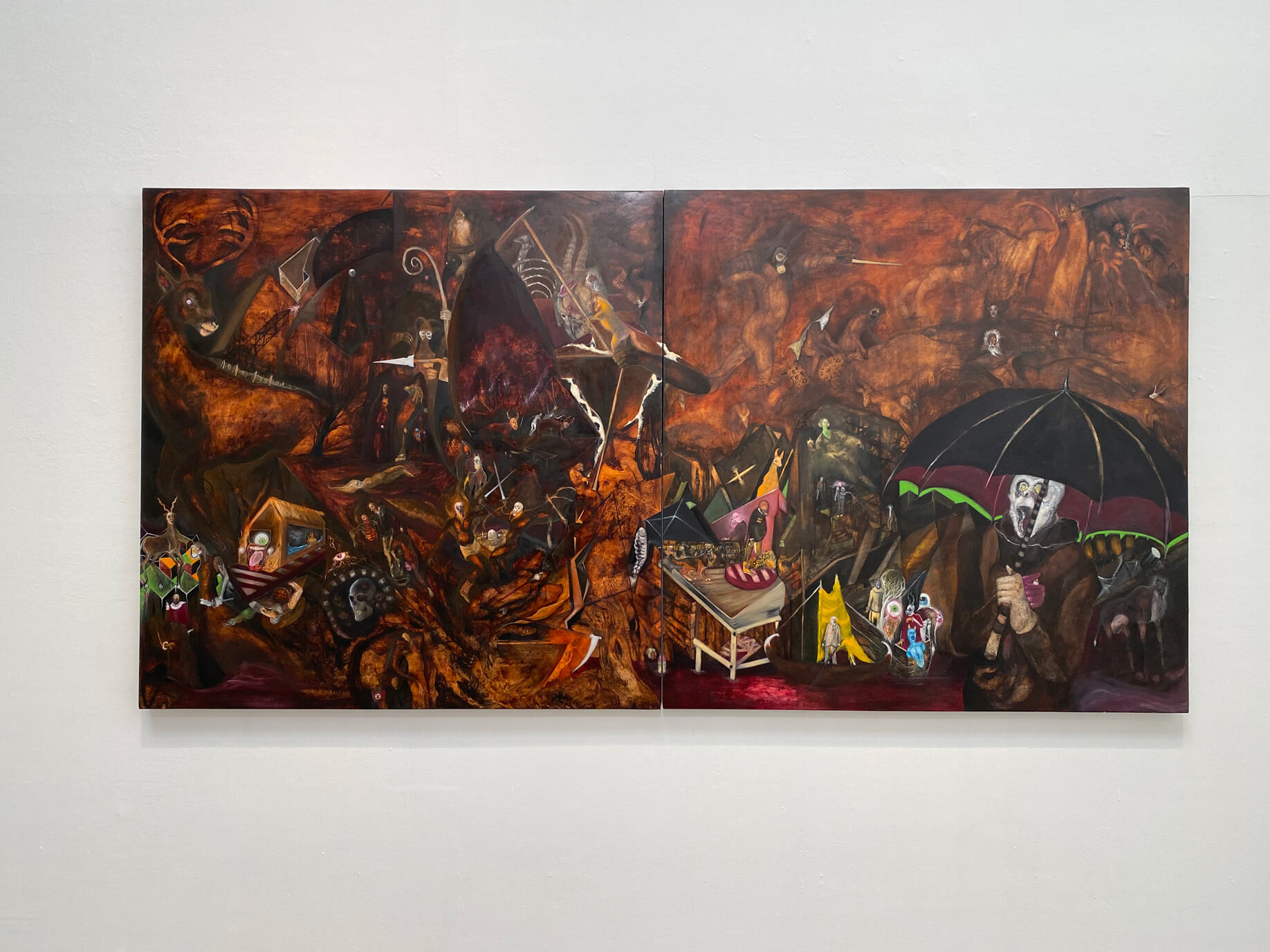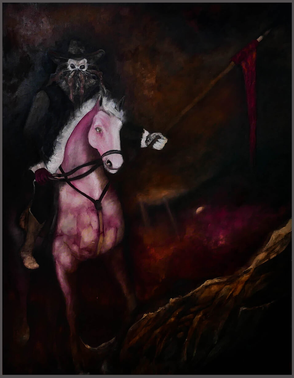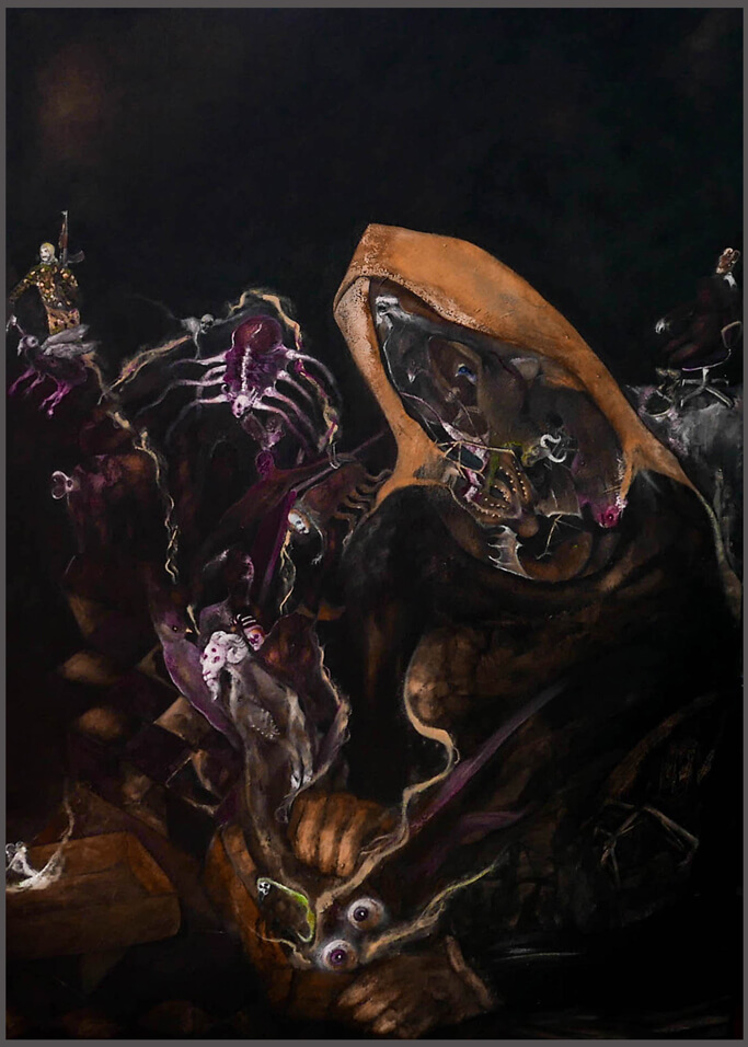 For the “Terra Pandemia” exhibition, D’Bayan has created a suite of paintings characterized by chaos, confusion, contagion, cultish behavior and other cursed things—a veritable dybbuk or Pandora’s Box of reverse goodies. In “Electric Don Quixote,” he imagines a wasteland with a figure recalling Clint Eastwood’s Man with No Name surveying the destruction and the desolation, carrying a flag that is an emblem of nothing. “Book of Blood” suggests how holy books have become eroded and corrupted by the filthy hands that touch and brandish them, with rats acting as counsels. “Still Life 2020” is a return to a few of the artist’s favorite aesthetic: gothic, brooding, shadowy, with a touch of the macabre. “Ecce Homo” is a smoothie of portraits by renaissance artists, Ancient Aliens and Planet of the Apes. The ‘Terra Pandemia” diptych is Dante’s Inferno doused with bleach and hydroxychloroquine. “It took me an entire year to finish these paintings,” says D’Bayan. “I started in November 2019. My colors were — for a lack of a better phrase — more optimistic then. But whatever life we had before the pandemic, it was snuffed out right in front of our eyes. My outlook changed with the marauding months of news cycles headlined by tyrants with their bagful of terrors. Death and defeat are at our doorstep and I had to recalibrate my approach to the new paintings.” Thus, the show is a manifesto of mayhem and cadaver colors.