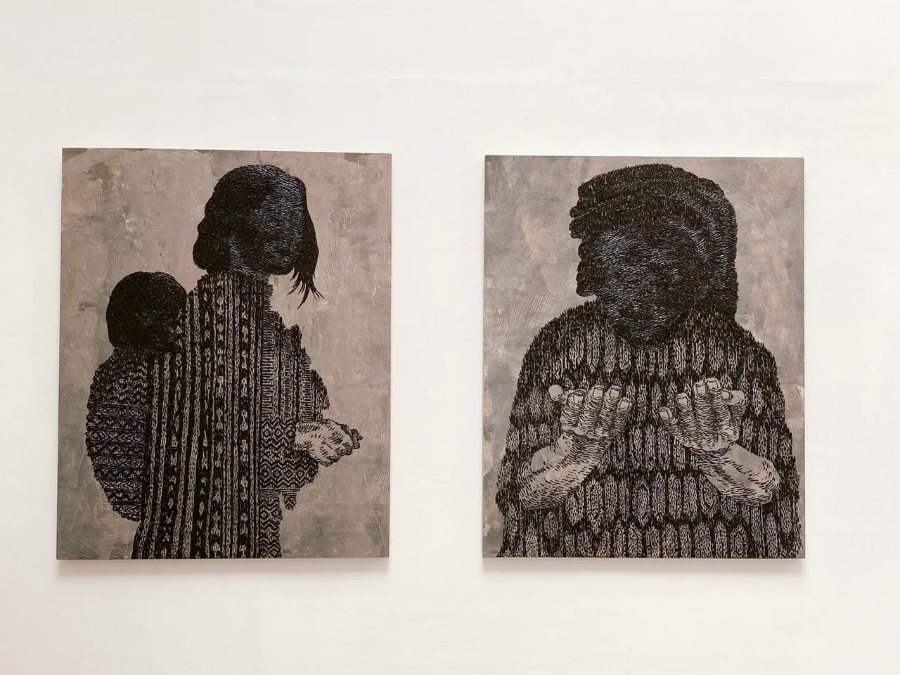 Archie Oclos’ portrayal of indigenous people in his works takes on a more familiar route as he not only inscribes patterns on an individual figure posing in front of the viewer with arms outstretched, but also in the space occupied by a mother and child. As he fills these silhouettes with earthy textures and tribal designs which give life to his figurative illustrations, he chooses to give form to maternal love and their other sentiments. With one of his pieces showing hands that lead to the center of the piece, one questions whether the figure is pleading or offering, and whether we have given enough attention to their plight.