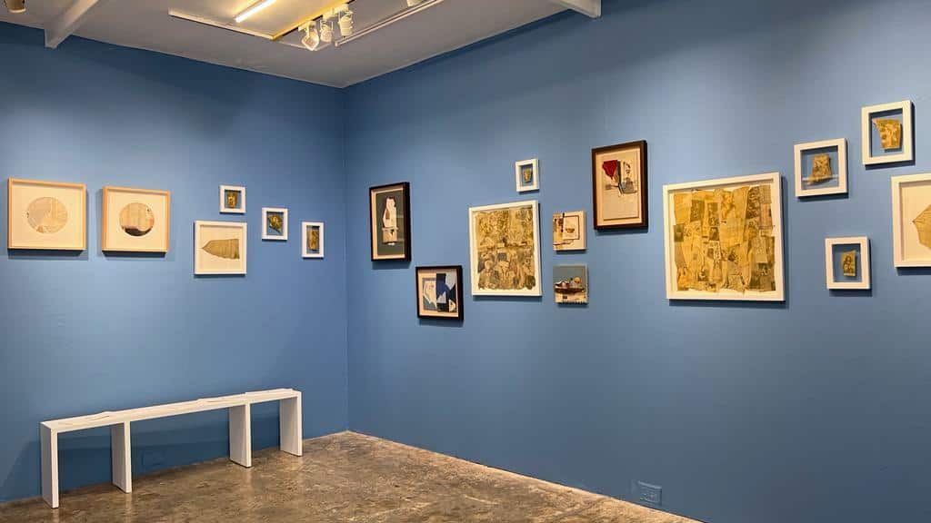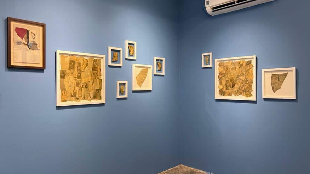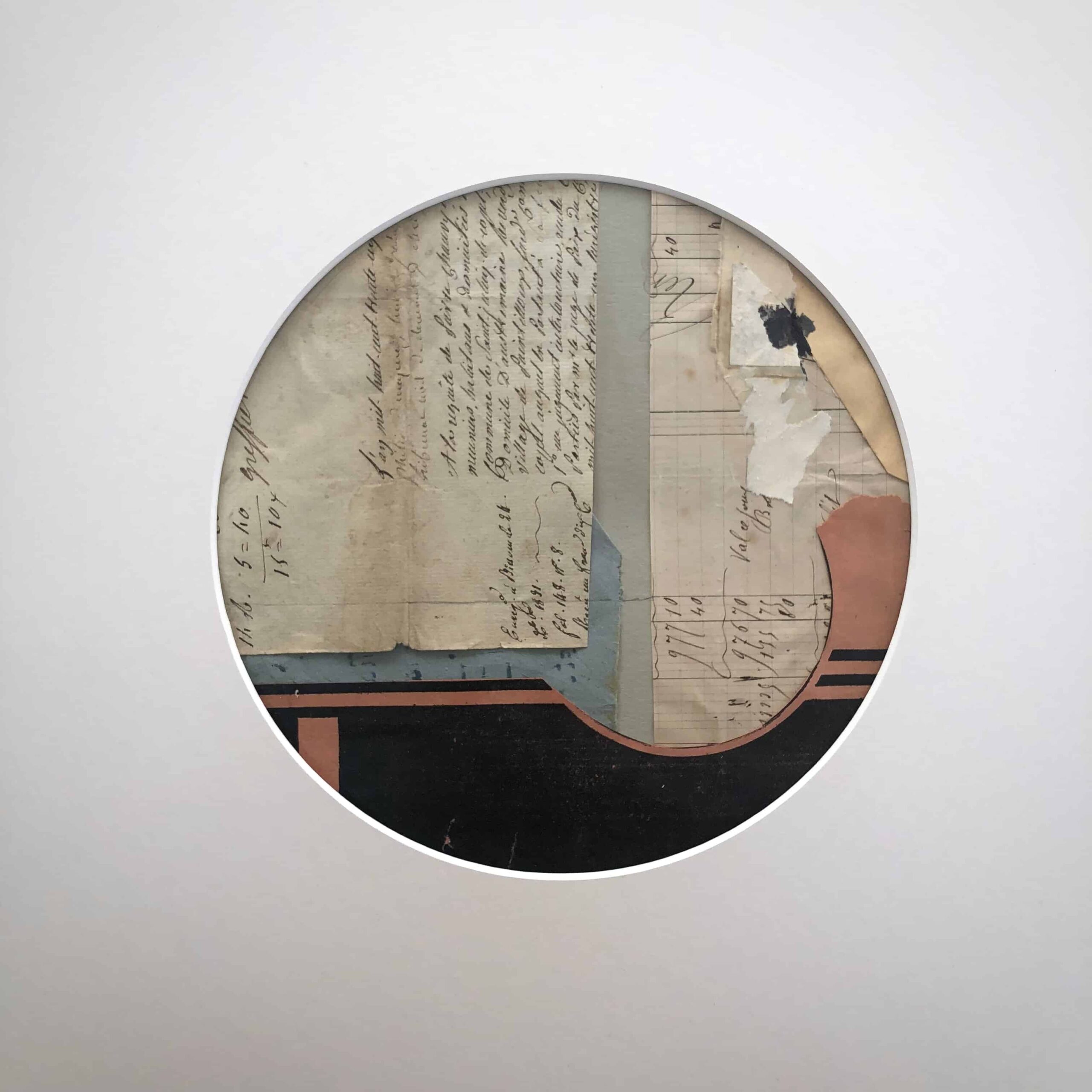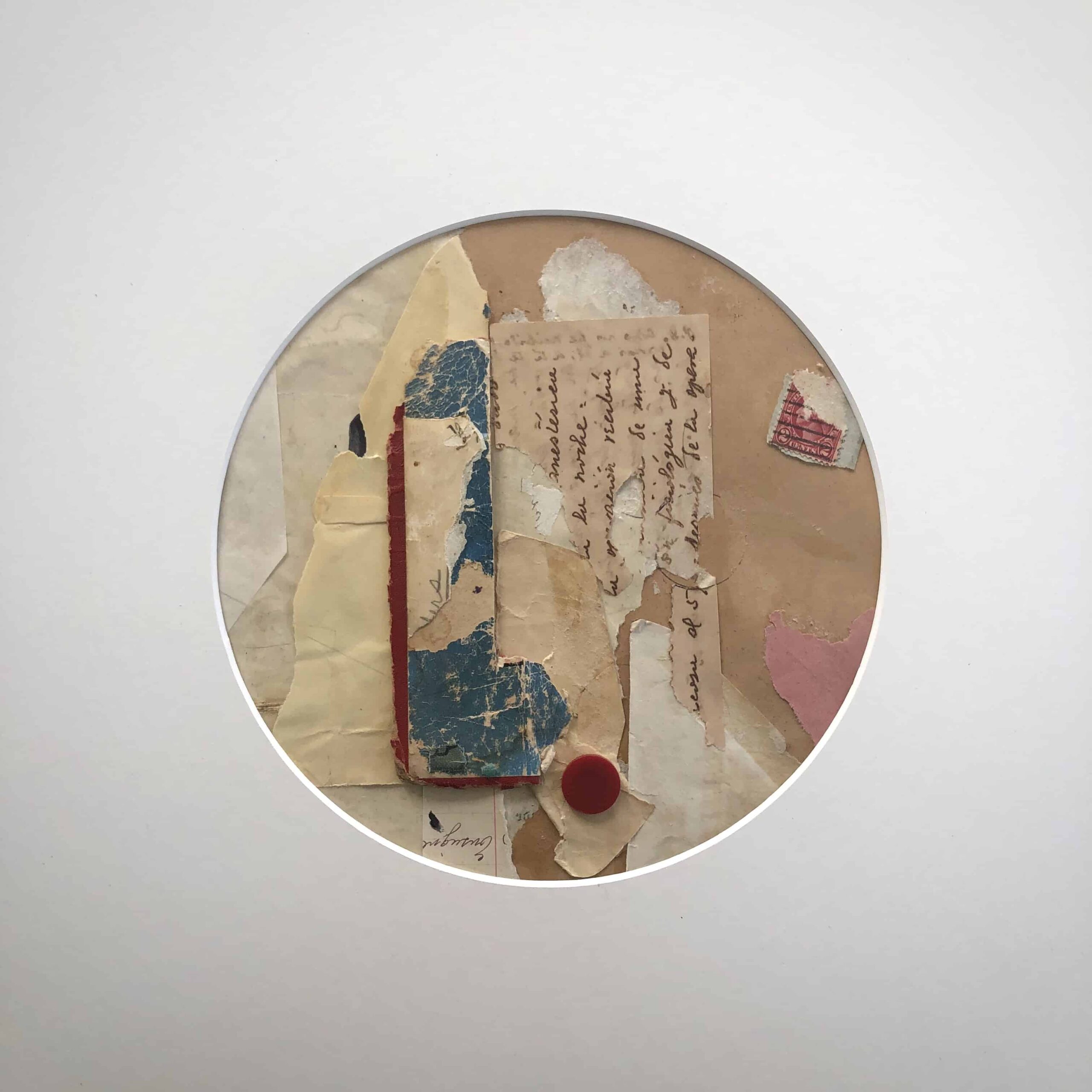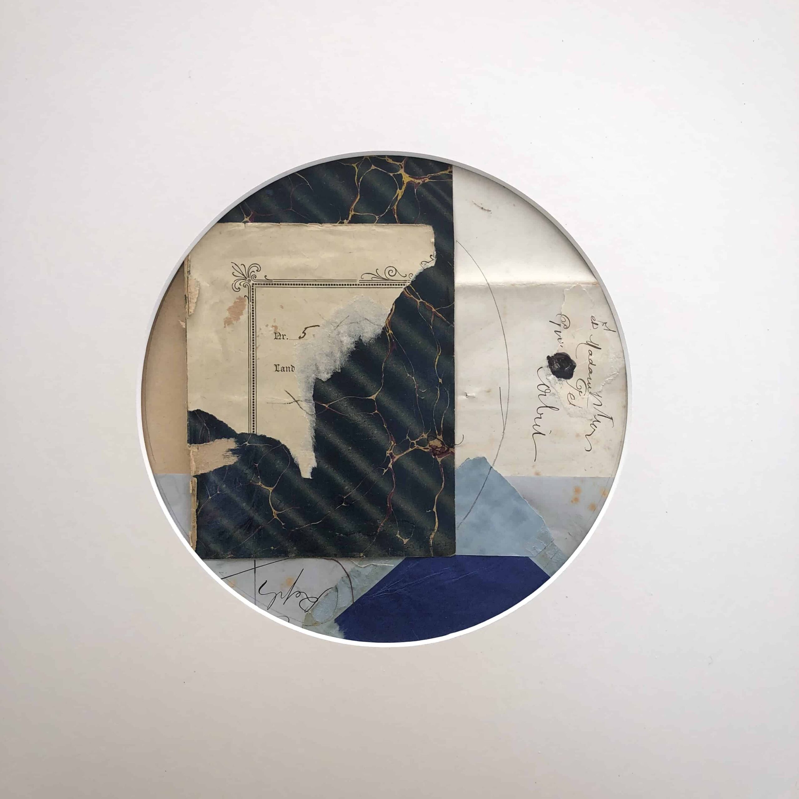 Her series of works for the show are a delicate combination of scraps that hold beautifully scripted penmanship, fragments of marbled book paper and other frayed book parts, envelopes and paper of different thicknesses and weights, in creamy shades or classic stationery blue. Traces of postage stamps and markings give us clues of dates and places; bits of writing give us a peak into the characters, their stories not quite lost…