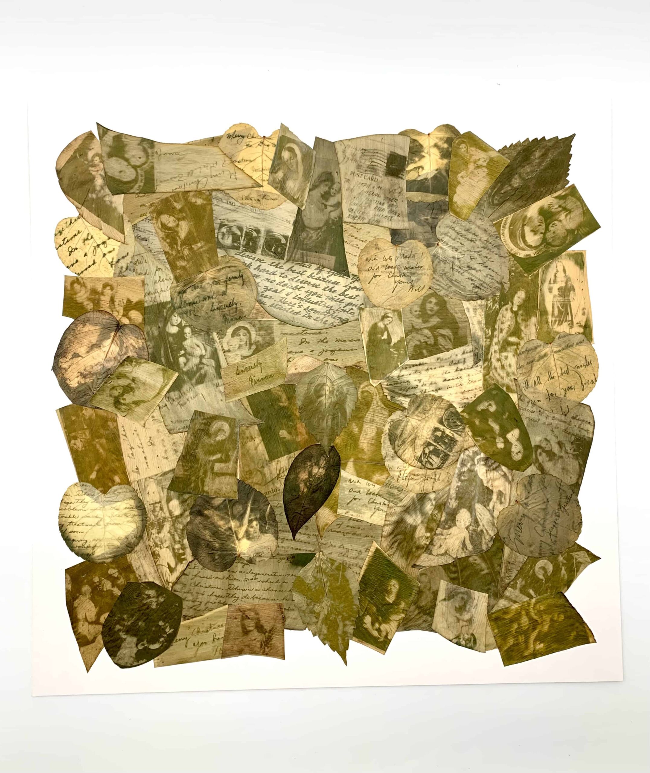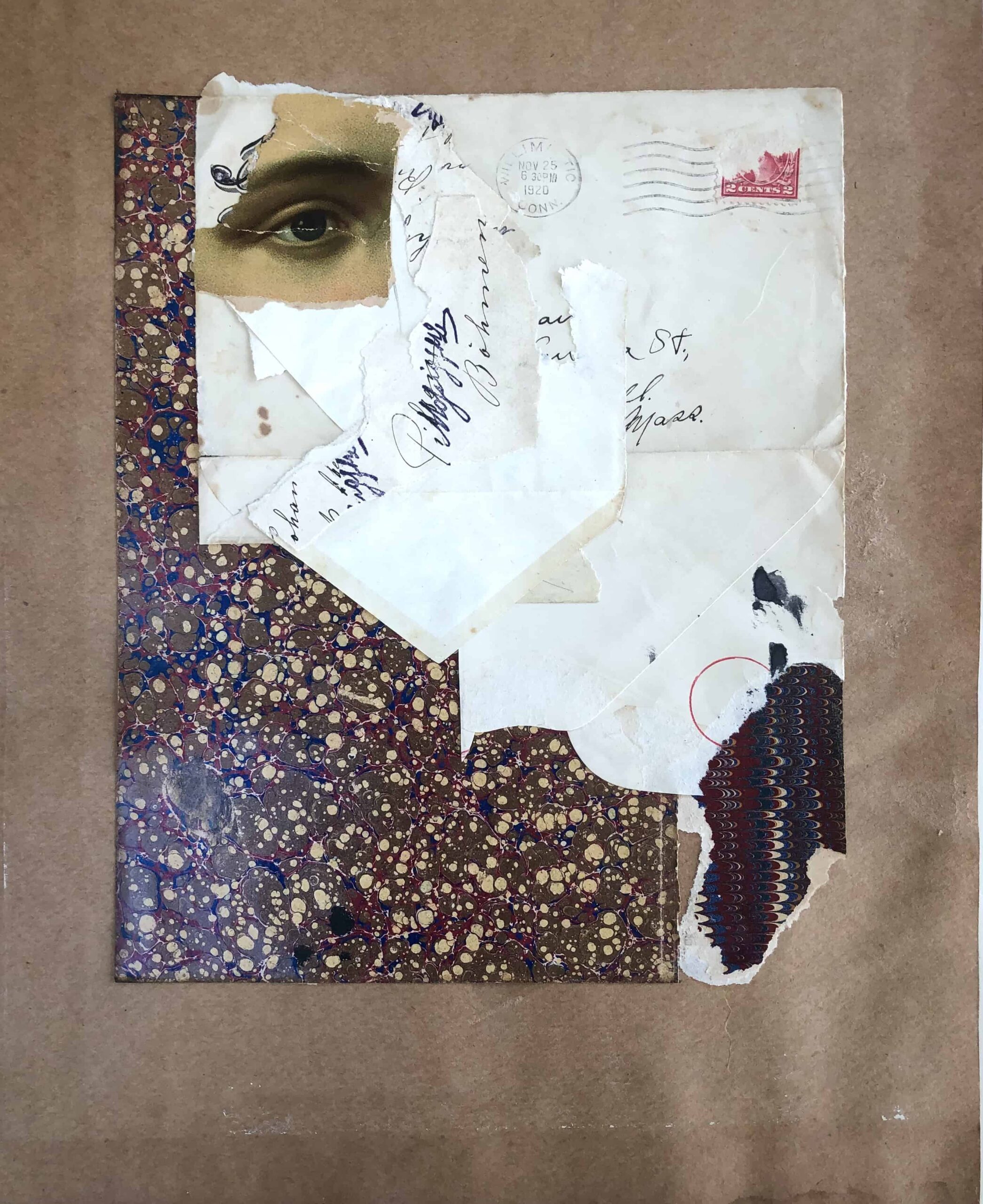 Urmaza’s collages feature old letters collected over the years from flea markets, thrift stores and through the digital sourcing site Etsy. They are artifacts from strangers that add a human element to her work, reflecting personal choices made with paper, ink, envelopes and postage stamps, the uniqueness of individual penmanship, carefully selected words, and the unavoidable erasures and mistakes crossed out, revealing the writer’s thought process. “I like how letters are tactile… and the thought that a letter received and held in the hand was once touched and mindfully crafted by its sender.” Like photographs, letters capture a moment in time, but unlike photographs, a handwritten letter cannot be exactly replicated; each letter is a unique work of art.